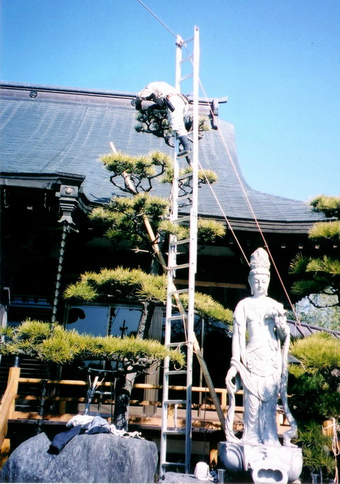 | 梯子のてっぺんに上って作業しても、マツの剪定をしても、特別料金はいただきません。上記の日当と枝葉の処理料金のみです。 |
